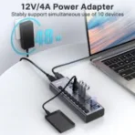 اكاسيس موزع USB يعمل بالطاقة بيانات 3.0 بـ10 منافذ ومفاتيح تشغيل-ايقاف فردية محول طاقة 12 فولت 4 امبير 48 واط 3.0 تمديد مقسم لماك بوك وماك برو-ميني واي ماك وسيرفس برو واللاب توب رمادي.