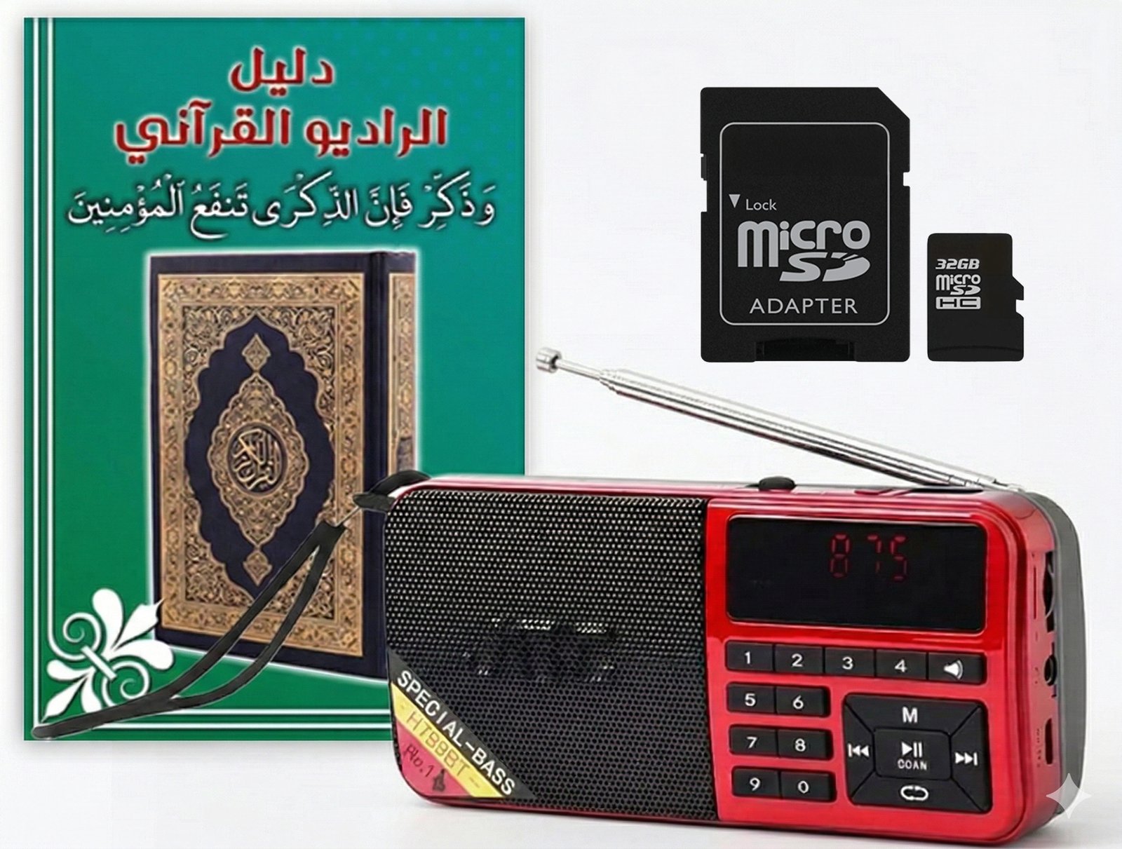المحتوى الصوتي 9999 مقطع صوتي (47 تلاوة مختلفة بصوت 41 قارئ + دروس وخطب وادعية وتفسير القرأن الكريم كامل) – يباع بدون الجهاز المشغل