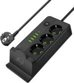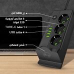 مشترك كهرباء متعدد الوظائف، 6 مقابس، 4 منافذ USB + منفذ Type-C، طول 2 متر، 2500 وات، اسود – 606U