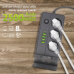 مشترك كهرباء نجمة، كبل 2 متر، 7 مداخل منهم 3 مدخل ثلاثي، بالاضافة الي عد 2 مدخل USB للشحن