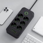 مشترك كهرباء 606U هو الحل المثالي لتنظيم وتشغيل مجموعة كبيرة من الأجهزة في وقت واحد بفضل تصميمه الذكي وإمكانياته المتعددة. يحتوي المشترك على 6 مقابس كهربائية قوية لتوصيل الأجهزة المنزلية والإلكترونية المختلفة، بالإضافة إلى 4 منافذ USB ومنفذ Type-C يمنحونك شحنًا سريعًا ومباشرًا للهواتف، التابلت، السماعات، والساعات الذكية دون الحاجة إلى شواحن إضافية.