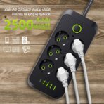 مشترك طاقة عالي الجودة بقدرة 2500 واط، مزود بـ 3 منافذ USB ومنفذ Type-C واحد، و6 مخارج كهرباء (Combo)، مع مفتاح تشغيل رئيسي، وشحن تلقائي بقوة 10 أمبير، وحماية من زيادة الحمل، وكابل بطول 2 متر | 634U