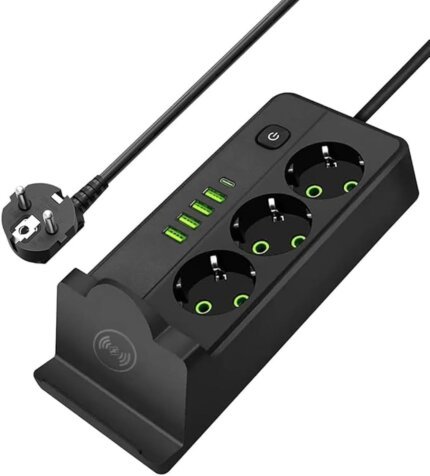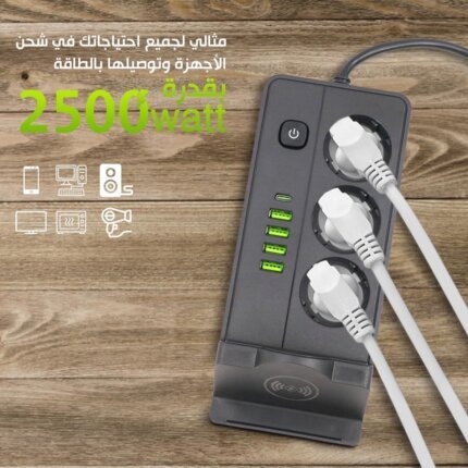 مشترك طاقة عالي الجودة بقدرة 2500 واط، مزود بـ 4 منافذ USB، ومنفذ Type-C واحد، ولوحة شحن لاسلكي، ومفتاح تشغيل رئيسي، وشحن تلقائي بقوة 10 أمبير، وحماية من زيادة الحمل، مع كابل بطول 3 أمتار | SLM-1080