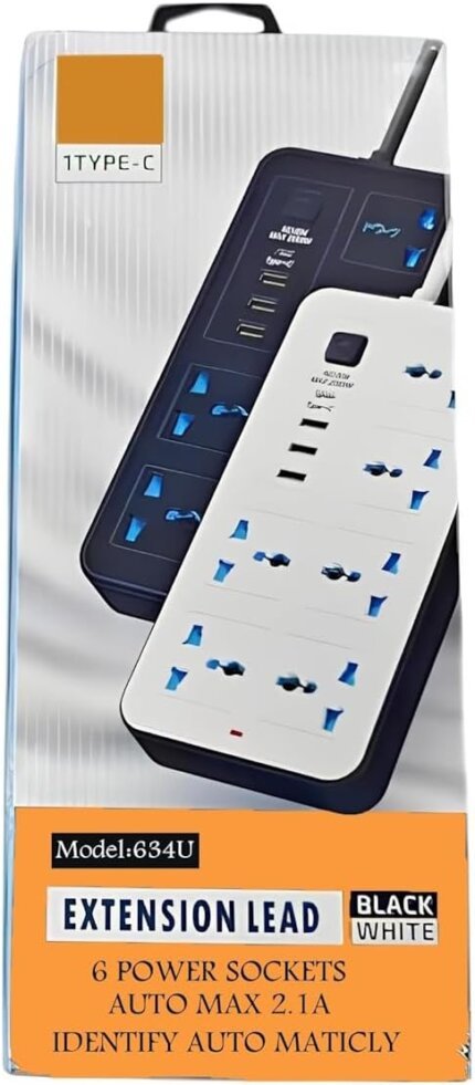 مشترك طاقة عالي الجودة بقدرة 2500 واط، مزوّد بـ 3 منافذ USB ومنفذ Type-C واحد، و4 مخارج كهرباء (Combo)، مع مفتاح تشغيل رئيسي، وشحن تلقائي بقوة 10 أمبير، وحماية من زيادة الحمل، وكابل بطول 2 متر | 633U