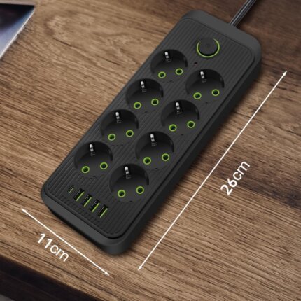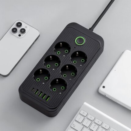 مشترك كهرباء متعدد الوظائف، 6 مقابس، 4 منافذ USB + منفذ Type-C، طول 2 متر، 2500 وات، اسود – 606U